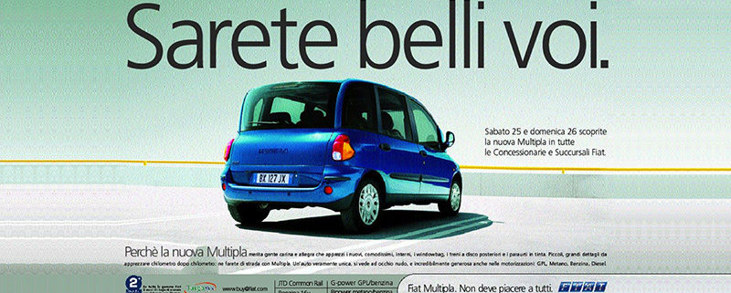 Insoma nel 1998 la Multipla si impone come auto per chi se la vuol godere con una buona dose di snobbismo, viste le linee inusuali che tanto la fanno amare ma che al tempo stesso la fanno odiare: “Sarete belli voi”, fu lo slogan che seguì il lancio, frutto dell’ampia derisione mediatica.